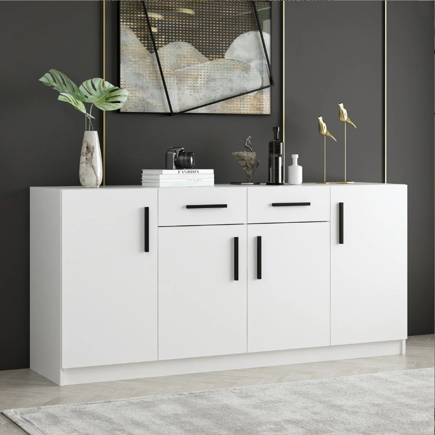 Este aparador cuenta con dos cajones con correderas telescópicas y cuatro puertas abatibles que esconden amplias divisiones internas. Estos espacios de almacenamiento son ideales para guardar desde vajillas hasta documentos y objetos personales, manteniendo todo organizado y al alcance.