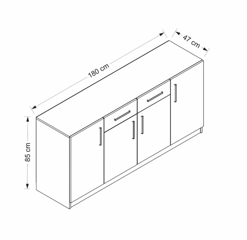 Con unas medidas de 85 cm de alto, 180 cm de ancho y 47 cm de profundidad, este aparador es lo suficientemente compacto como para caber en espacios pequeños, pero lo suficientemente grande como para ofrecer un almacenamiento amplio y funcional. Es perfecto para el comedor, el salón o incluso el dormitorio.