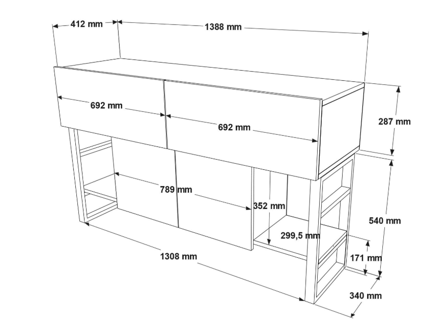 El aparador está fabricado con melamina de 18 mm de alta calidad, garantizando una gran resistencia y durabilidad. Este material no solo es robusto, sino que también es fácil de limpiar y mantener, asegurando que el mueble se mantenga en perfectas condiciones a lo largo del tiempo.
