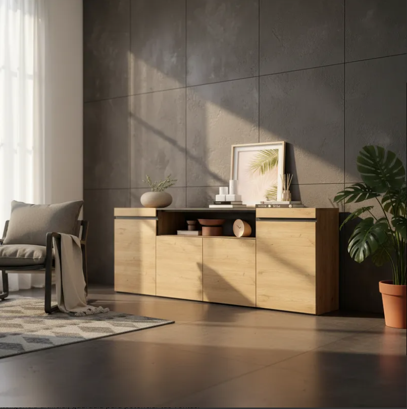 Aparador Moderno de 4 Puertas en Color Roble: Elegancia y Funcionalidad en un Solo Mueble