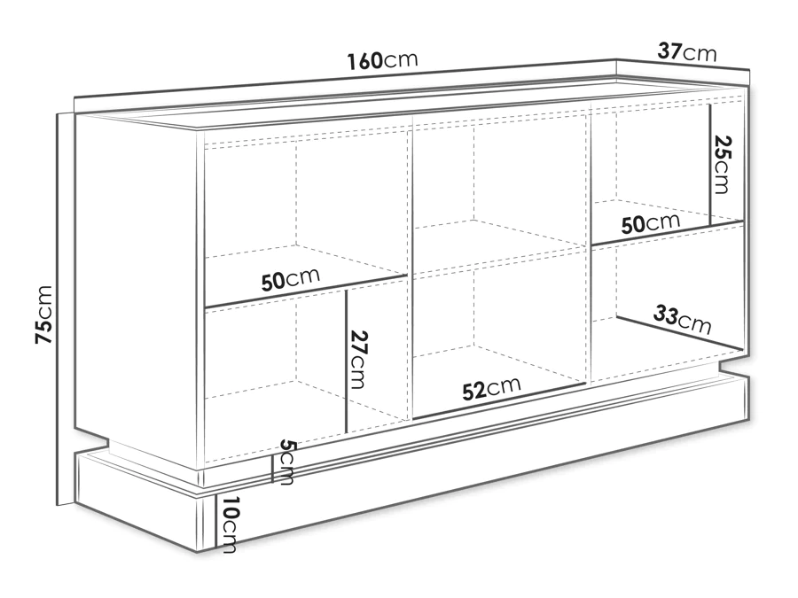 Con medidas precisas de 75 cm de alto, 160 cm de ancho y 37 cm de profundidad, esta pieza de mobiliario está diseñada para adaptarse a cualquier espacio, proporcionando una solución elegante y práctica para tus necesidades de almacenamiento.