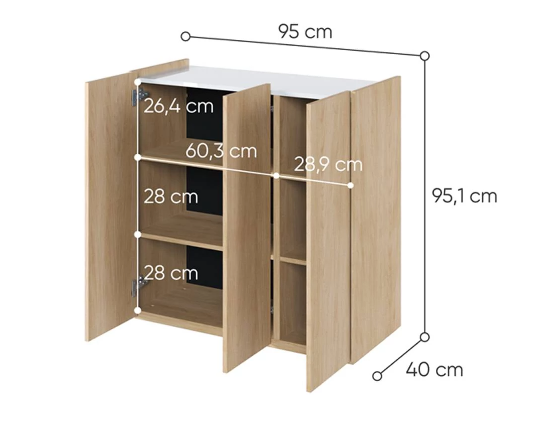 Con unas medidas de 95 cm de alto, 95 cm de ancho y 40 cm de profundidad, este aparador es lo suficientemente compacto como para caber en espacios pequeños, pero lo suficientemente grande como para ofrecer un almacenamiento amplio y funcional. Es perfecto para el comedor, el salón o incluso el dormitorio.