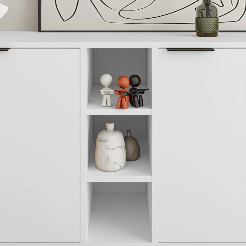 Este aparador cuenta con tres puertas abatibles que esconden amplias divisiones internas. Estos espacios de almacenamiento son ideales para guardar desde vajillas hasta documentos y objetos personales, manteniendo todo organizado y al alcance.