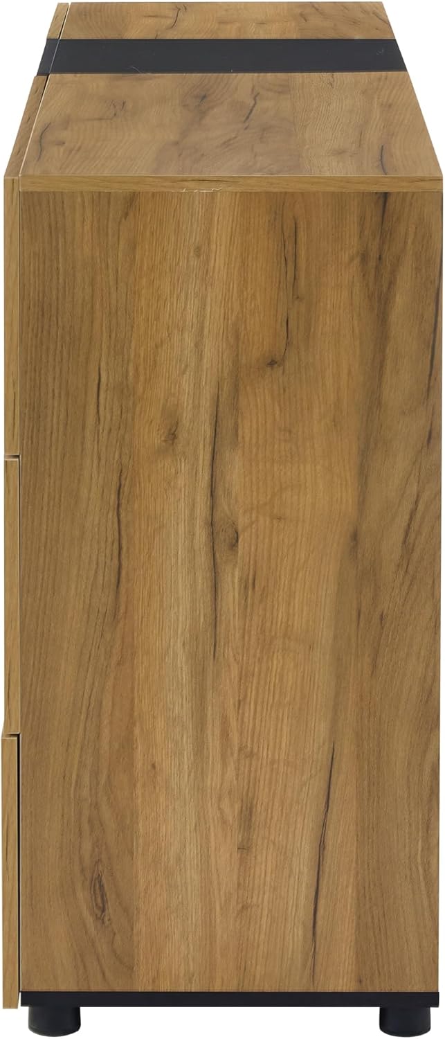 Este aparador cuenta con tres cajones con correderas telescópicas y una puerta abatible que esconden amplias divisiones internas. Estos espacios de almacenamiento son ideales para guardar desde vajillas hasta documentos y objetos personales, manteniendo todo organizado y al alcance.