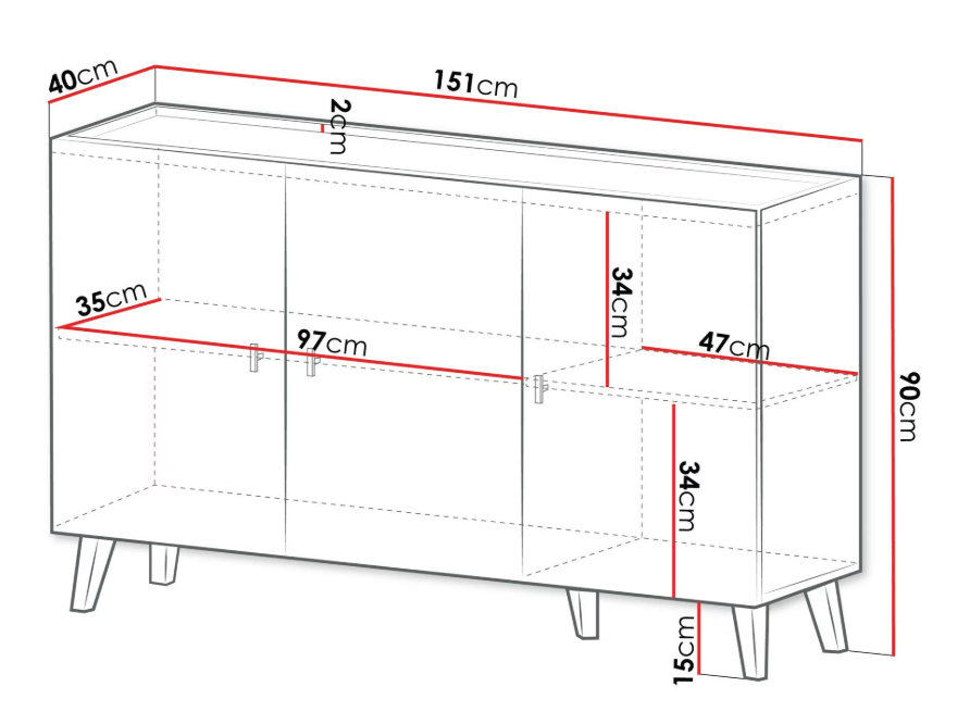 Con unas medidas de 90 cm de alto, 150 cm de ancho y 40 cm de profundidad, este aparador es lo suficientemente compacto como para caber en espacios pequeños, pero lo suficientemente grande como para ofrecer un almacenamiento amplio y funcional. Es perfecto para el comedor, el salón o incluso el dormitorio.