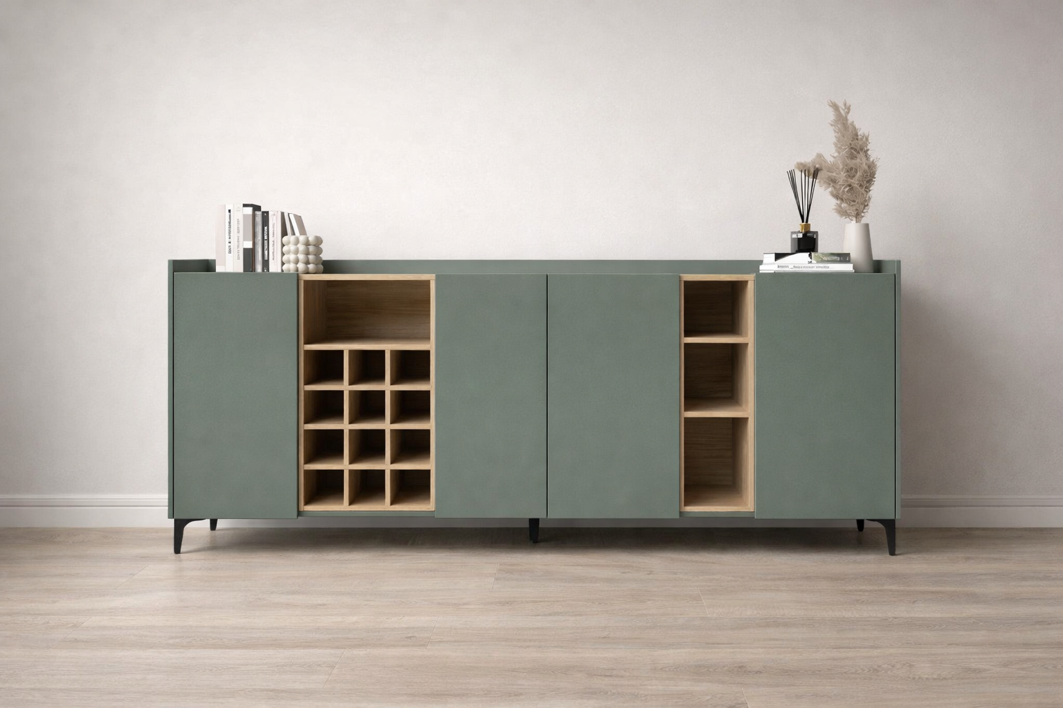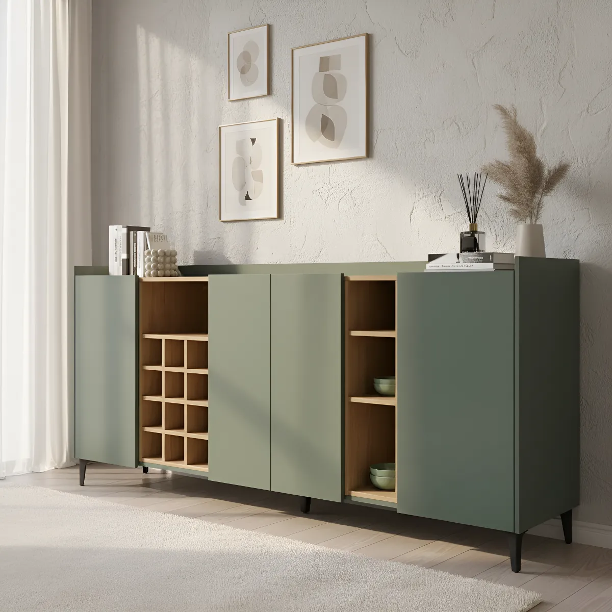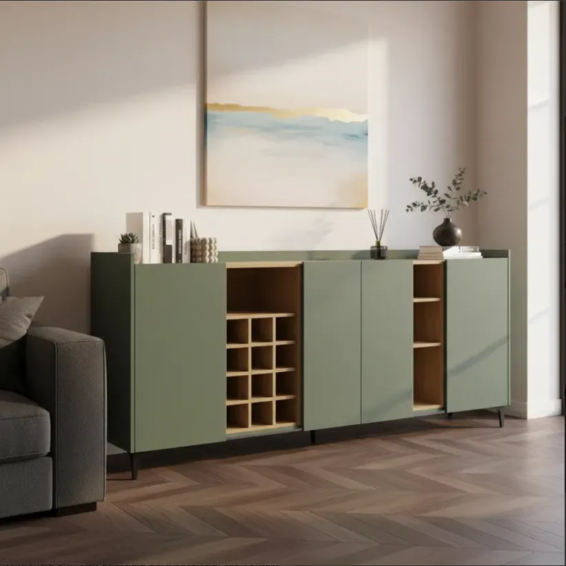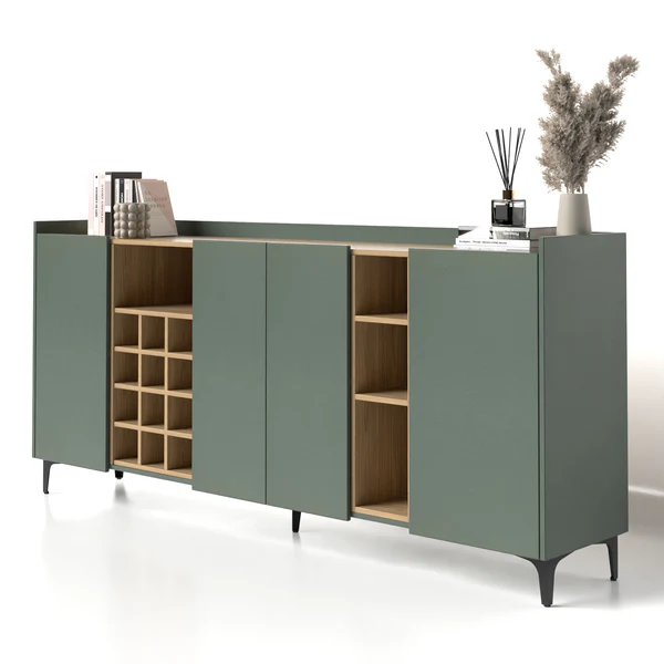 Este aparador cuenta con cuatro puertas abatibles que esconden amplias divisiones internas. Estos espacios de almacenamiento son ideales para guardar desde vajillas hasta documentos y objetos personales, manteniendo todo organizado y al alcance.