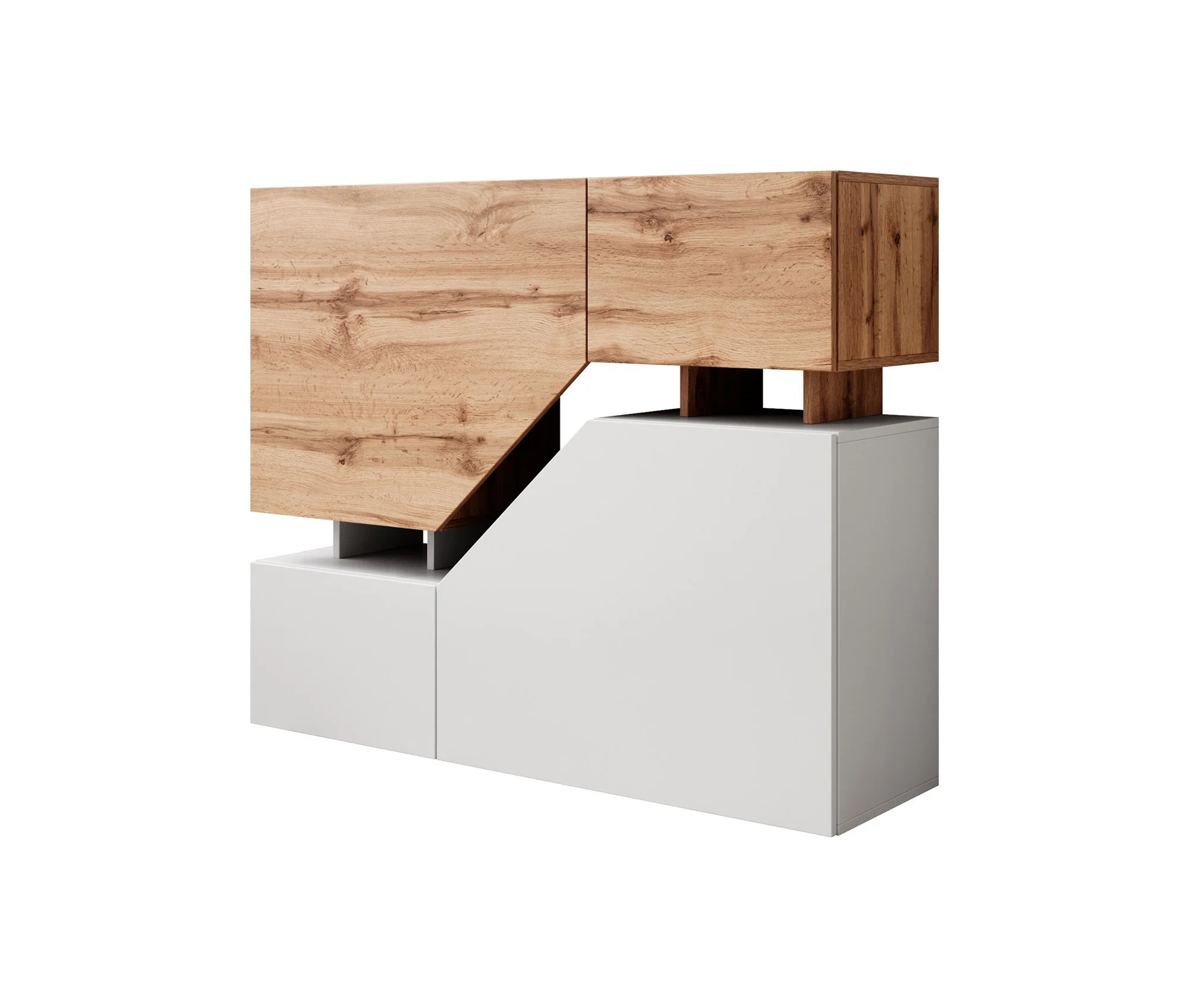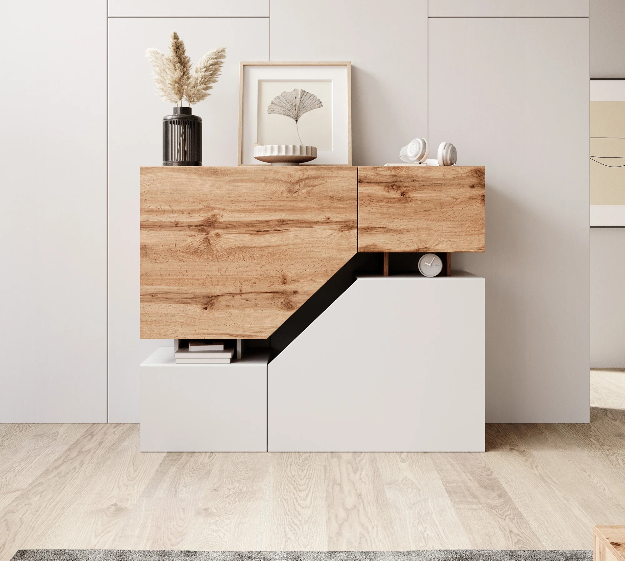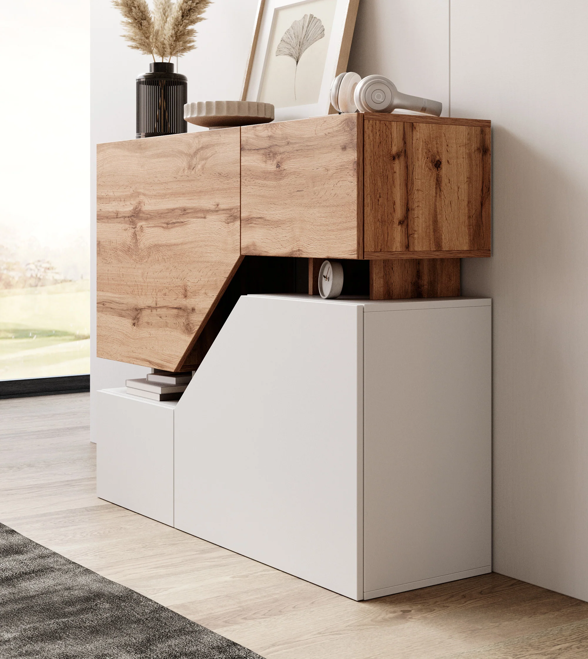 El acabado en color duna y blanco de esta aparador, combinado con los cortes especiales, aporta un toque de elegancia y modernidad a cualquier espacio. Este diseño sofisticado se adapta a diversos estilos de decoración, convirtiendo la cómoda en un elemento destacado y atractivo.