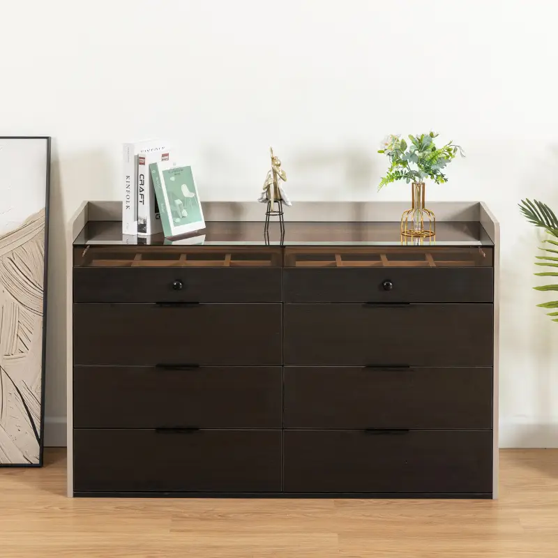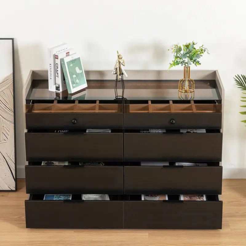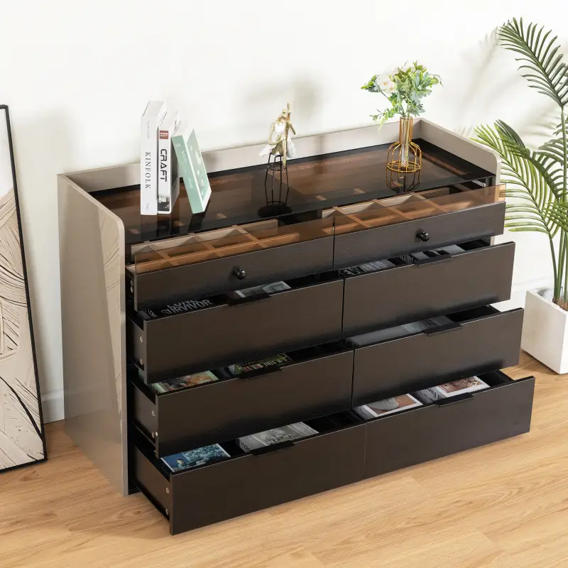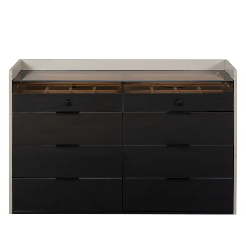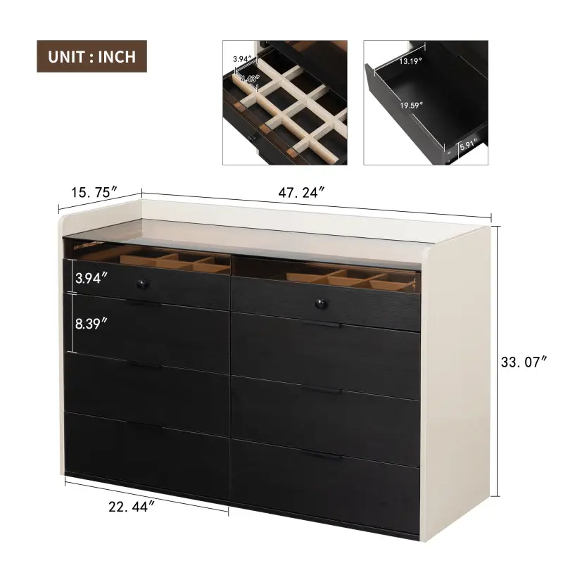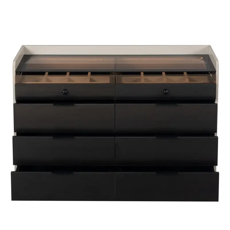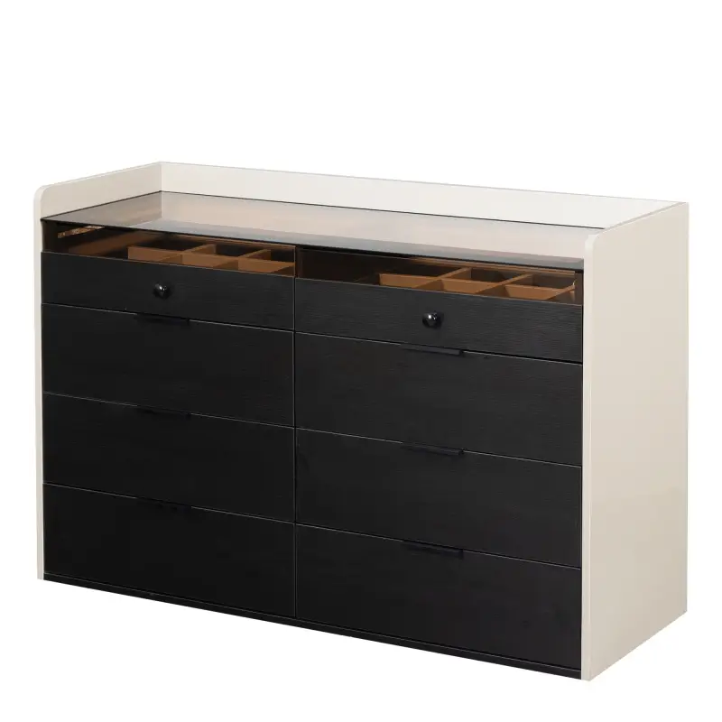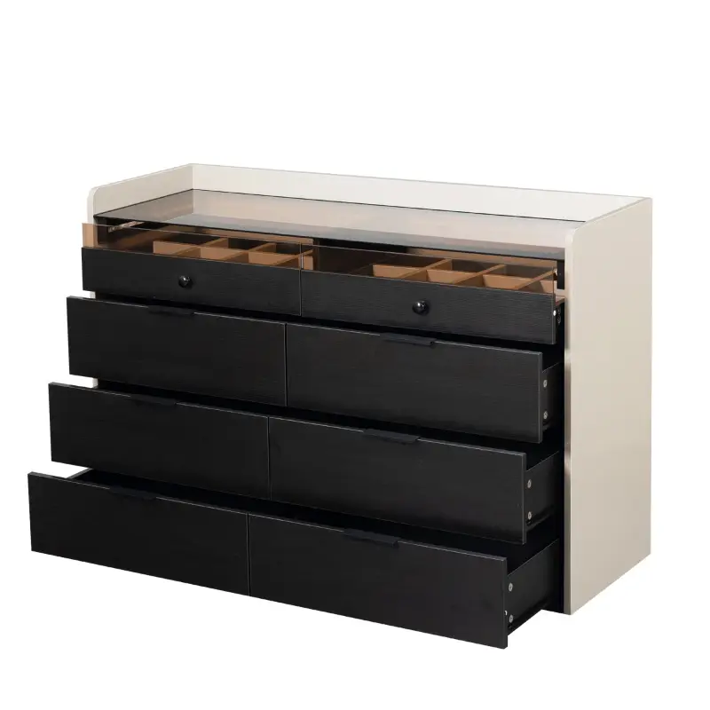 Los 8 amplios cajones de esta cómoda proporcionan un almacenamiento generoso para toda tu ropa, los dos de arriba sirve para joyeri accesorios y artículos personales. Cada cajón está diseñado para maximizar el espacio interno, permitiéndote mantener todo organizado y fácilmente accesible.