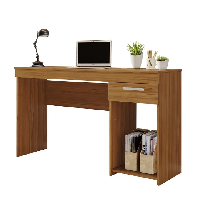 El escritorio con un cajon y estante, fabricado en melamina color caramelo de alta calidad, es la solución perfecta para quienes buscan combinar estilo, funcionalidad y durabilidad en su espacio de trabajo. Este escritorio no solo mejora su productividad, sino que también aporta una estética moderna y ordenada a su oficina o estudio.
