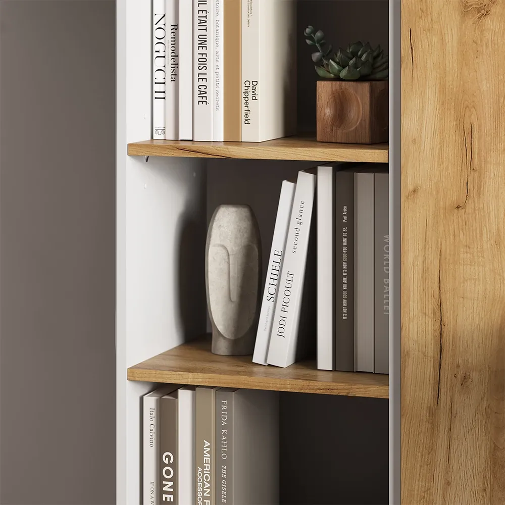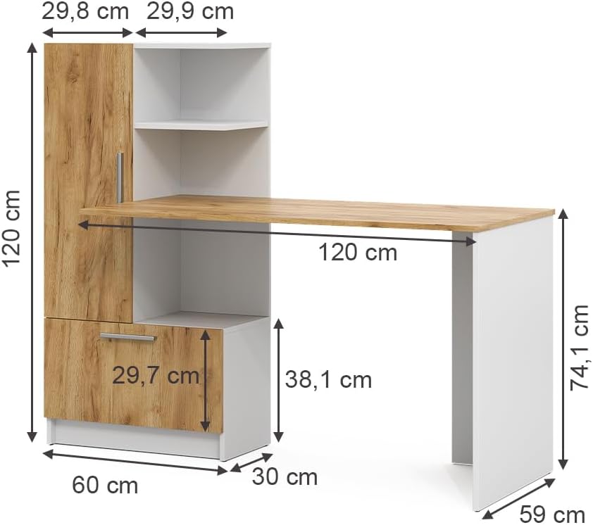Un espacio de trabajo eficiente comienza con un escritorio bien diseñado. Nuestro escritorio con 2 puertas abatibles con tiradores y un estantes abierto espacioso es la elección ideal para quienes buscan una combinación perfecta de funcionalidad y estilo. Este mueble, en un sofisticado color blanco y roble, no solo optimiza tu espacio de trabajo, sino que también añade un toque de elegancia moderna a cualquier habitación.