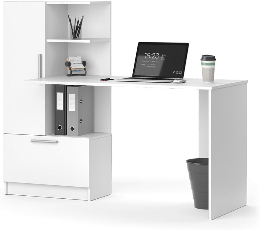 Escritorio Funcional De MDP Con 2 Puertas Abatibles: Blanco El Escritorio Funcional con 2 puertas abatibles y estantes es súper moderno, compuesto por paneles 100% MDP de 18 mm, proporcionándole resistencia a rayones y golpes. Correderas telescópicas para un mejor deslizamiento de los cajones. Muebles de fácil montaje. Este producto está configurado para montarse solo en un lado específico, es decir, no tiene montaje flexible. 2 puertas abatibles, ESPACIO PARA ARMARIO, PRODUCTO COMPACTO, Se entrega totalmente armado Su garantía es de 3 meses en madera y en herrajes.