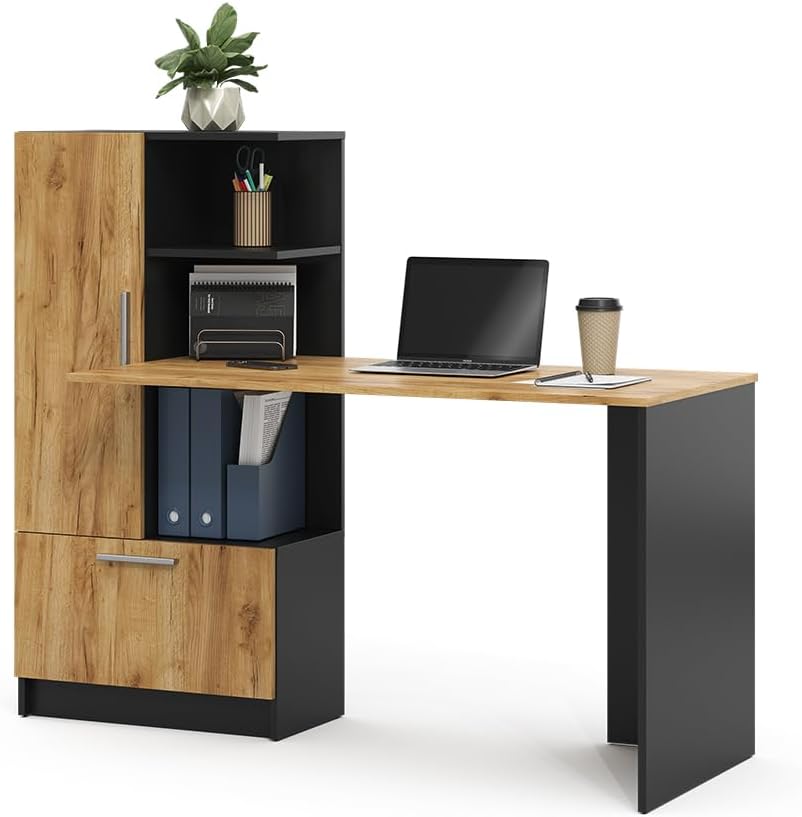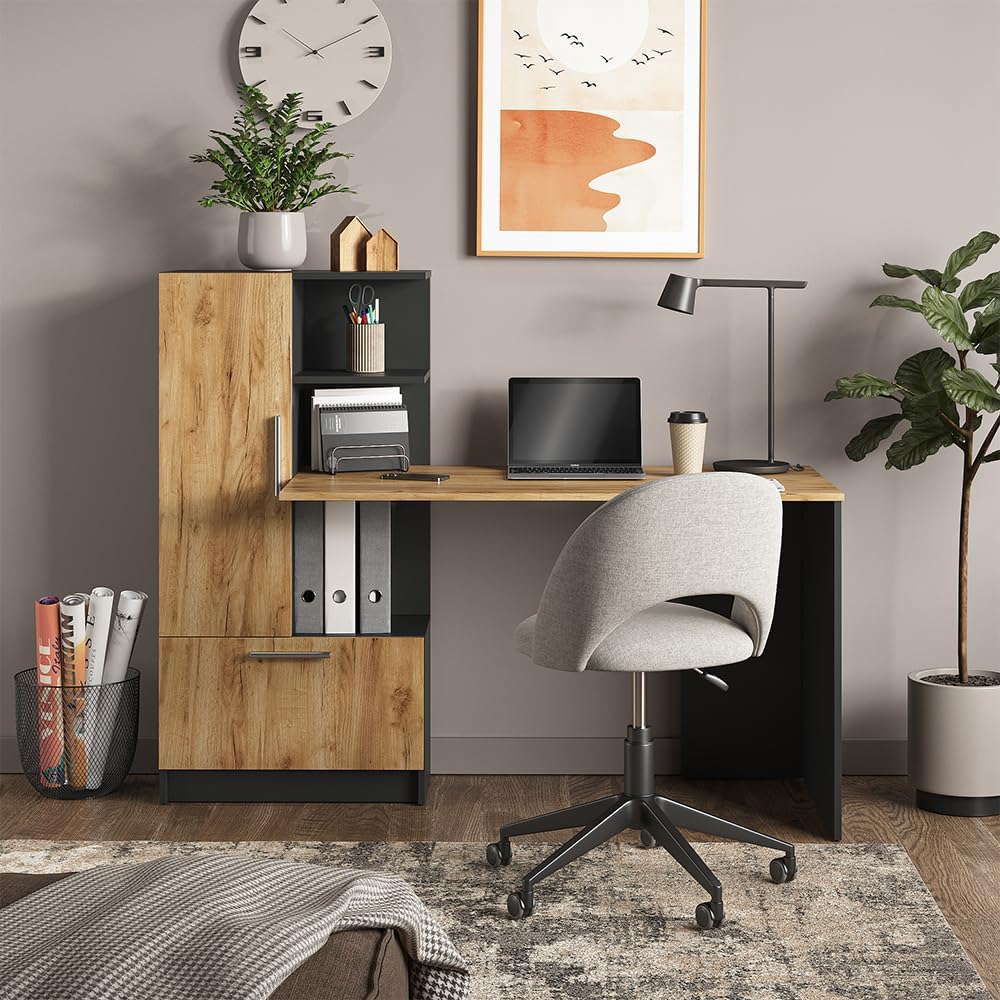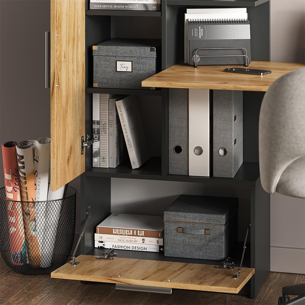Un espacio de trabajo eficiente comienza con un escritorio bien diseñado. Nuestro escritorio con 2 puertas abatibles con tiradores y estantes abiertos superior espacioso es la elección ideal para quienes buscan una combinación perfecta de funcionalidad y estilo. Este mueble, en un sofisticado color negro y roble, no solo optimiza tu espacio de trabajo, sino que también añade un toque de elegancia moderna a cualquier habitación.