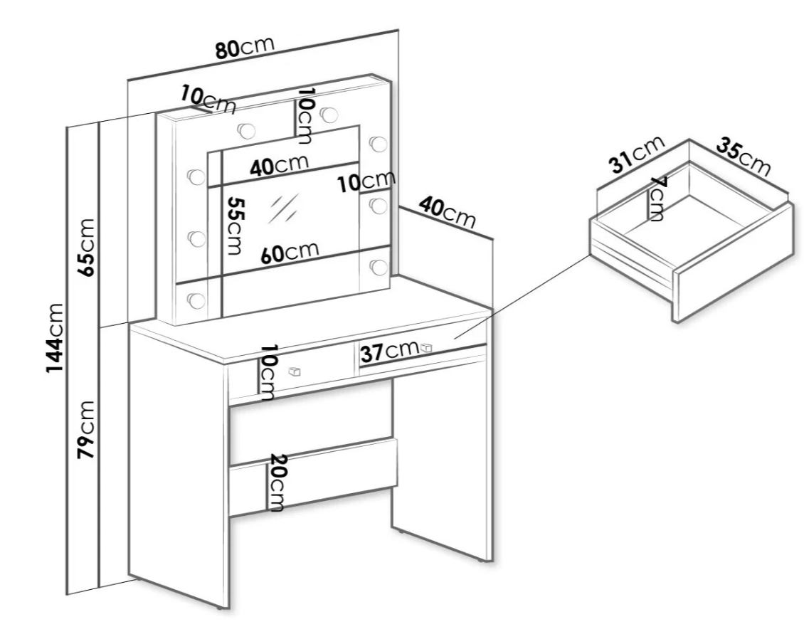 Su diseño compacto se adapta a cualquier espacio, ya sea en dormitorios, vestidores o estudios de maquillaje profesional.Para su uso, simplemente enciende las luces LED utilizando el interruptor incorporado y disfruta de una iluminación óptima para tu rutina de maquillaje. Los cajones deslizables facilitan el acceso a tus productos, mientras que la superficie espaciosa ofrece un amplio espacio para colocar tus herramientas de belleza.
